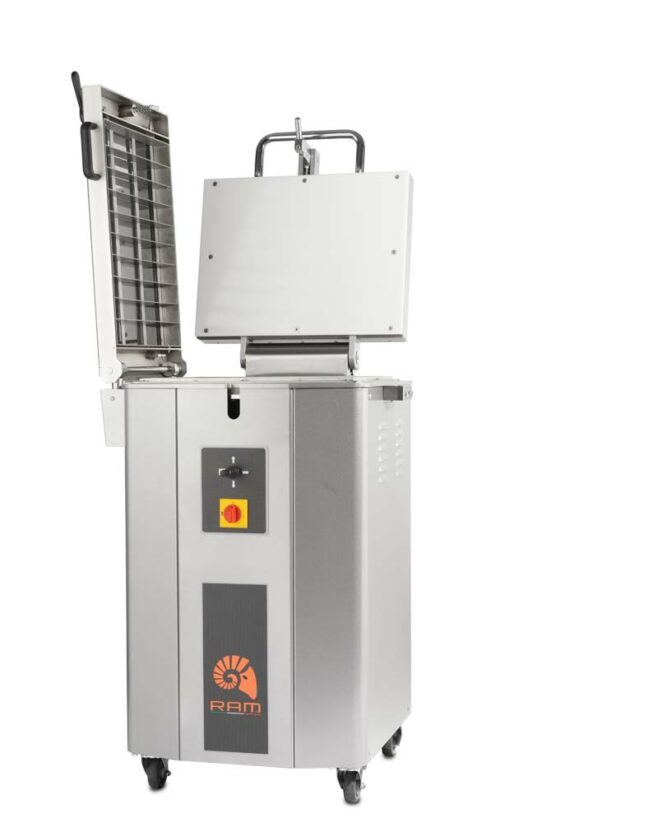 Machine suitable for dividing dough for bakeries, pastry shops and pizzerias. Steel furnace painted structure. Basket in stainless steel AISI 304. Complete hydraulic work with large tank and double seal between tank and hydraulic unit. AISI 304 stainless steel blades bolted not welded to guarantee greater precision and longevity. High quality non-expandable food brands. Stainless steel corrosion protection over the stamping plate. Stainless steel collection tray is easy to reach thanks to side covers mounted on hinges. Push button for cleaning knives. On wheels made of soft rubber with brakes for greater stability and silence.